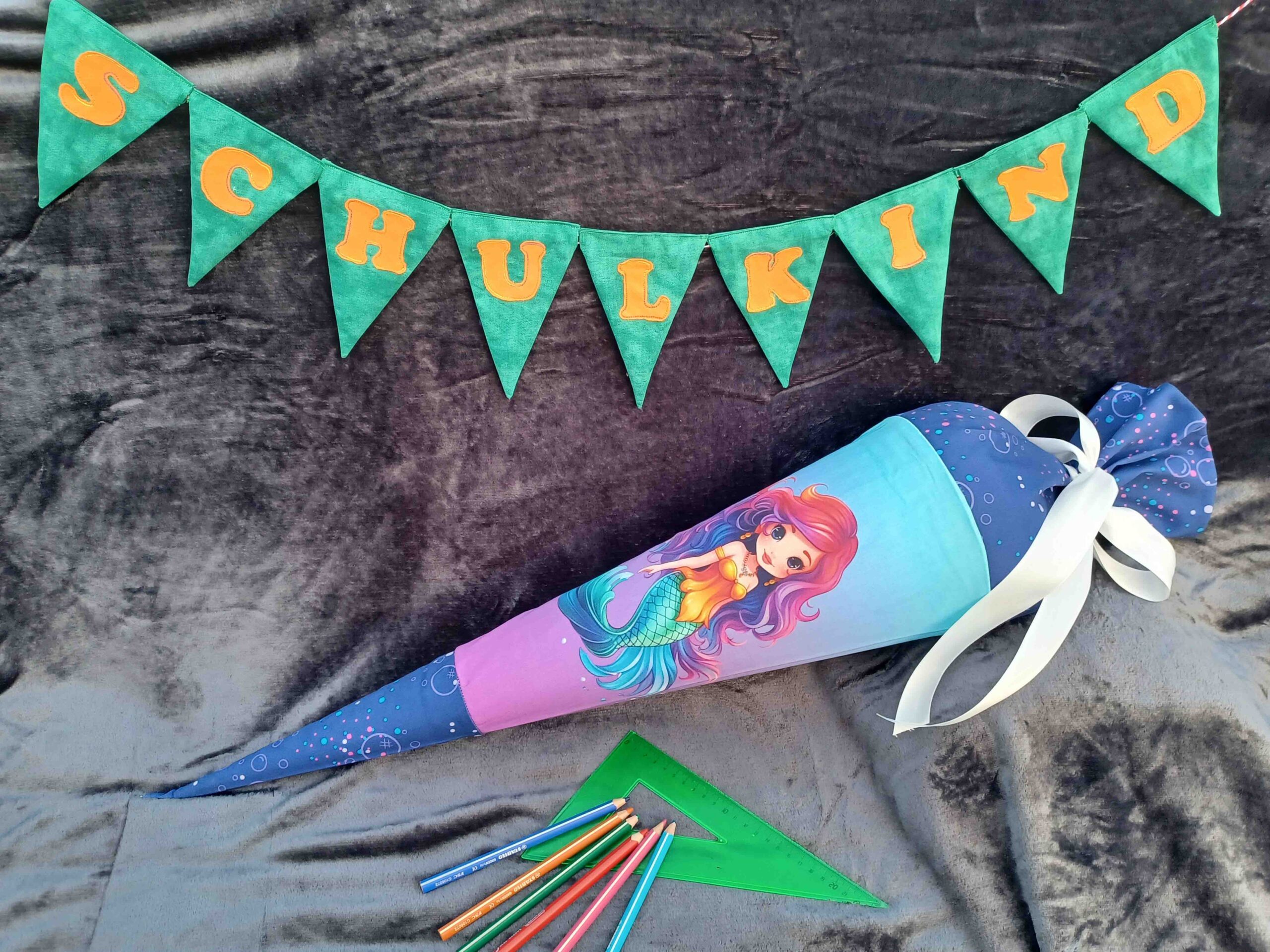 Sie erhalten hier eine ZauberZuckertüte aus Webware mit einem Meerjungfrauenmotiv. Die Krone besteht aus einer farblich passenden Webware mit Blubberblasen.
