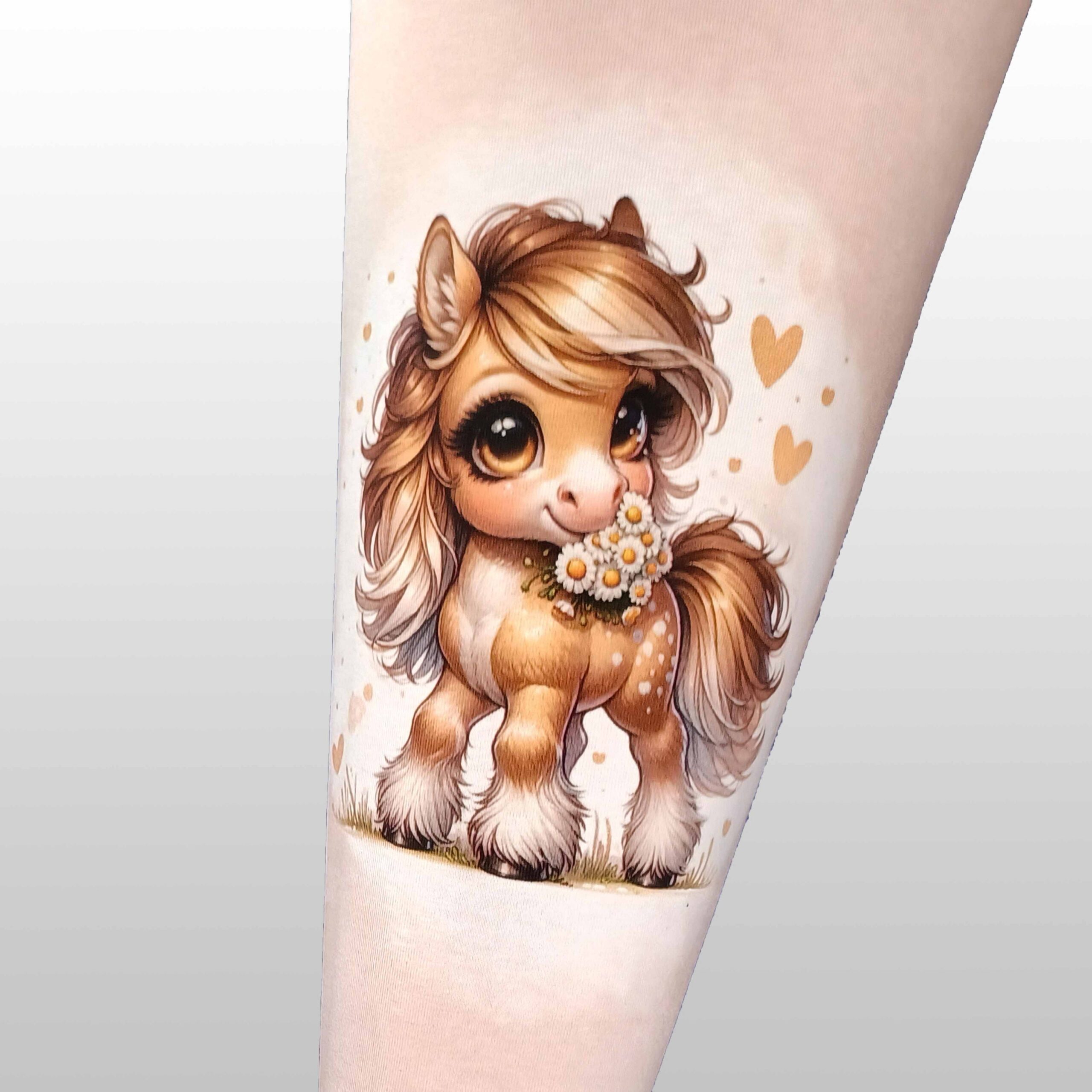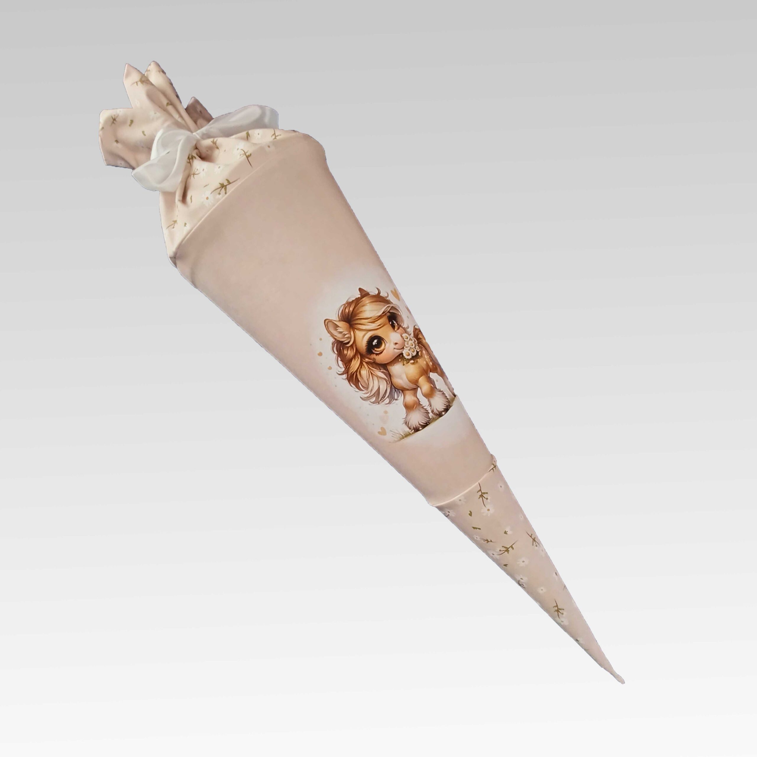Sie erhalten hier eine ZauberZuckertüte aus weichem, beigefarbenem Jersey mit einem süßen Ponymotiv. Die Krone besteht aus einem farblich passenden Jersey mit Gänseblümchen.