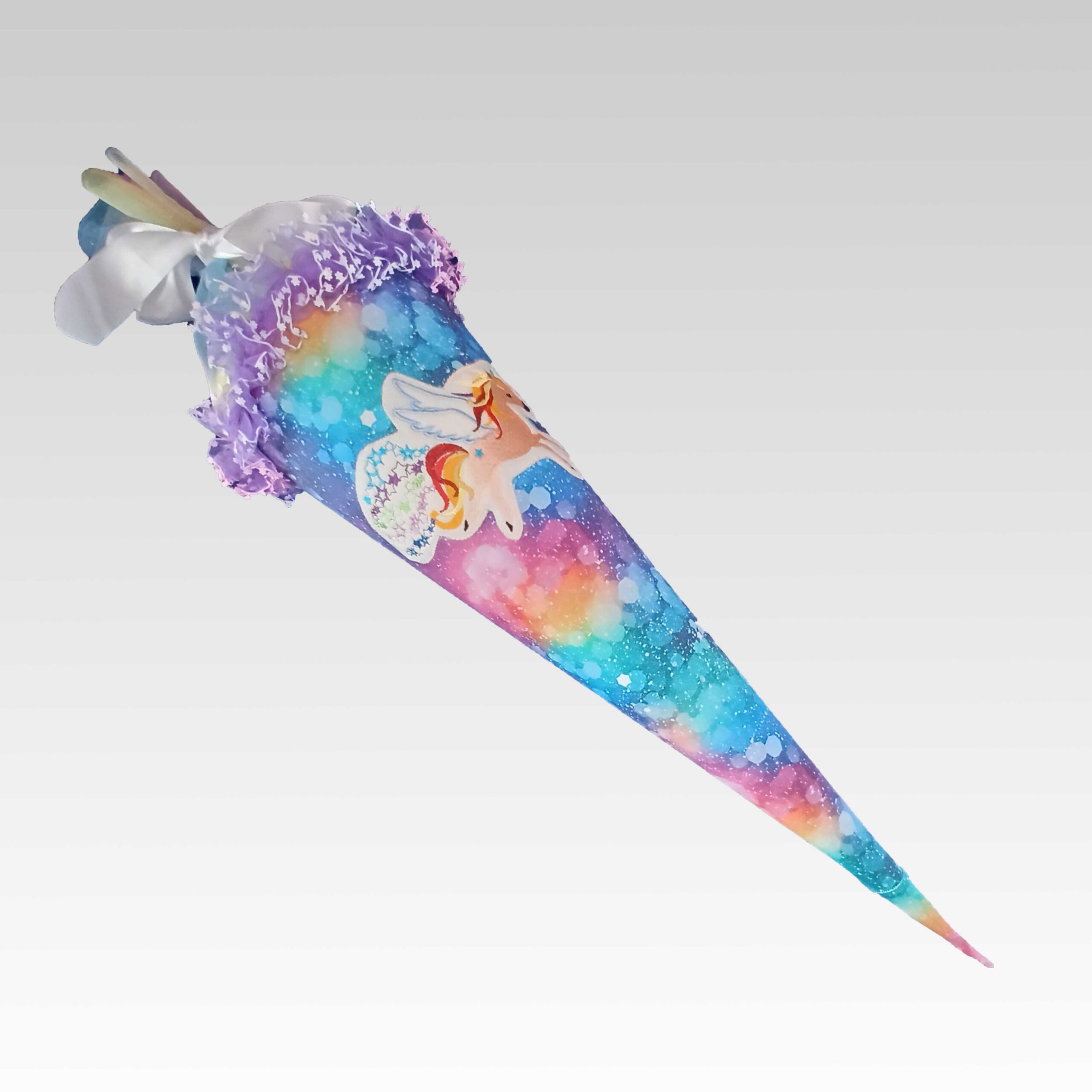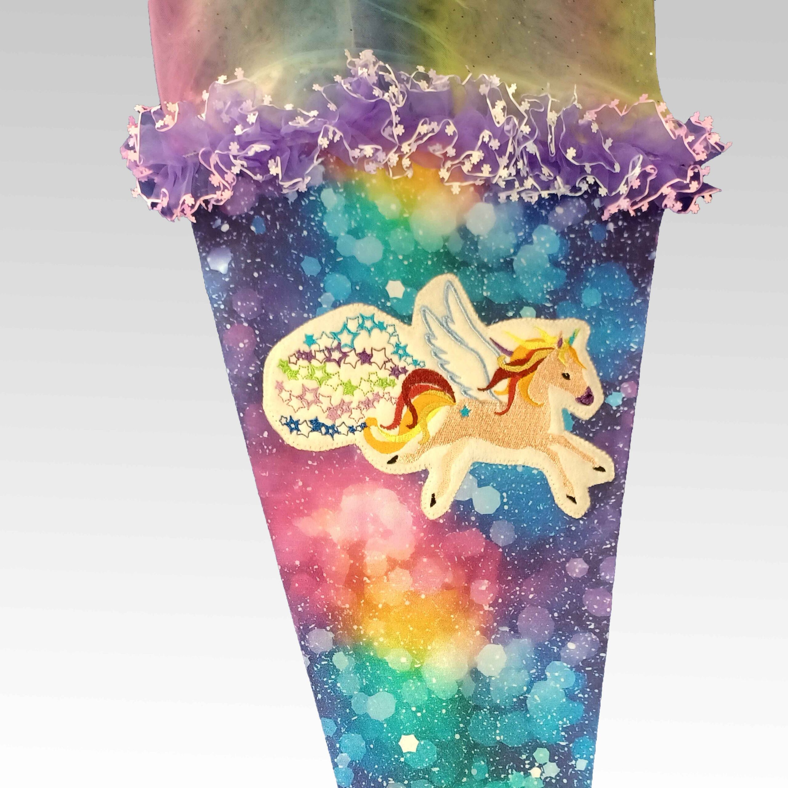 Sie erhalten hier eine ZauberZuckertüte aus weichem, regenbogenfarbenen Jersey mit einem gestickten Einhornmotiv. Die Krone besteht aus einer farblich passenden Softtüll. Eine Besonderheit ist die lilafarbene Rüschenspitze am oberen Rand.